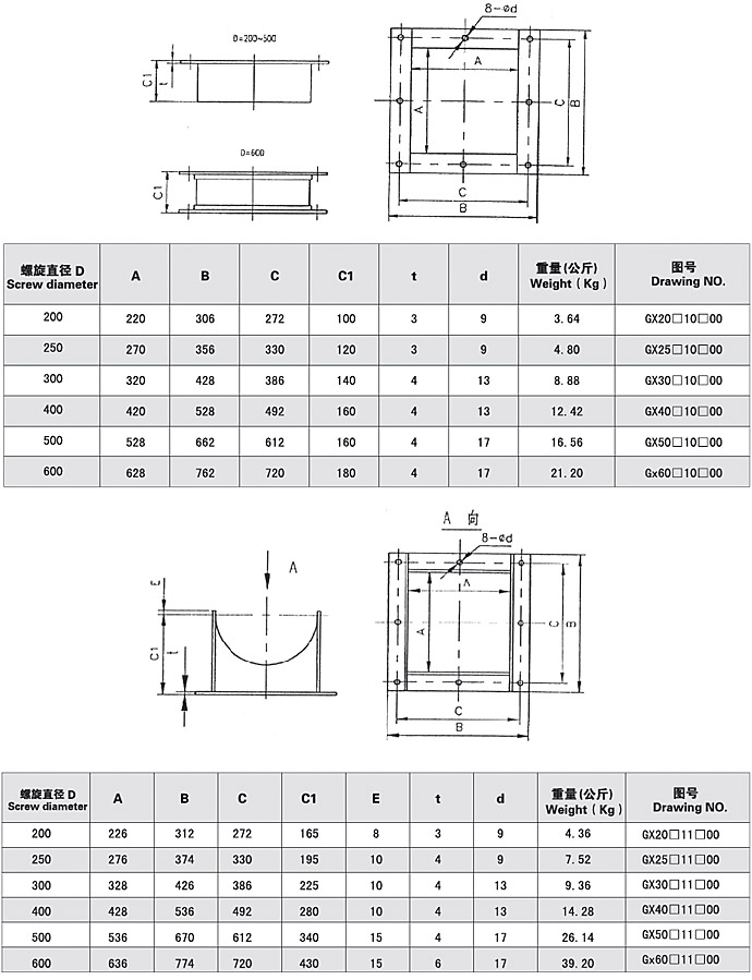 GX螺旋機的出料口有方形出料口、手推式出料口和齒條式出料口三種.后兩種出料口拉板的開閉方向,隨安裝不同而分右裝、左裝兩種: